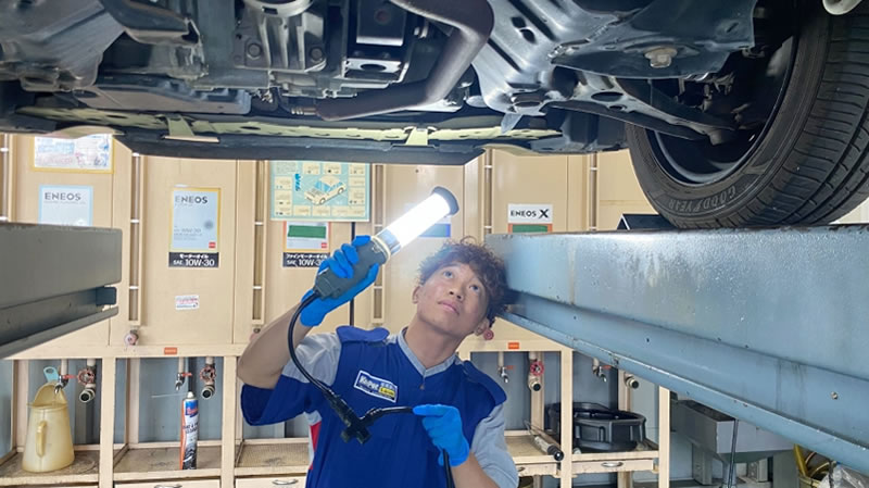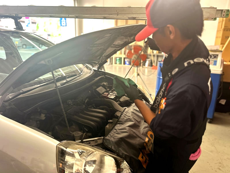 整備記録簿に基づき、ディーラー車検と同じ法定56項を点検します。外装・フロントガラス・信号用具の点検後にエンジンルームの点検を行います。